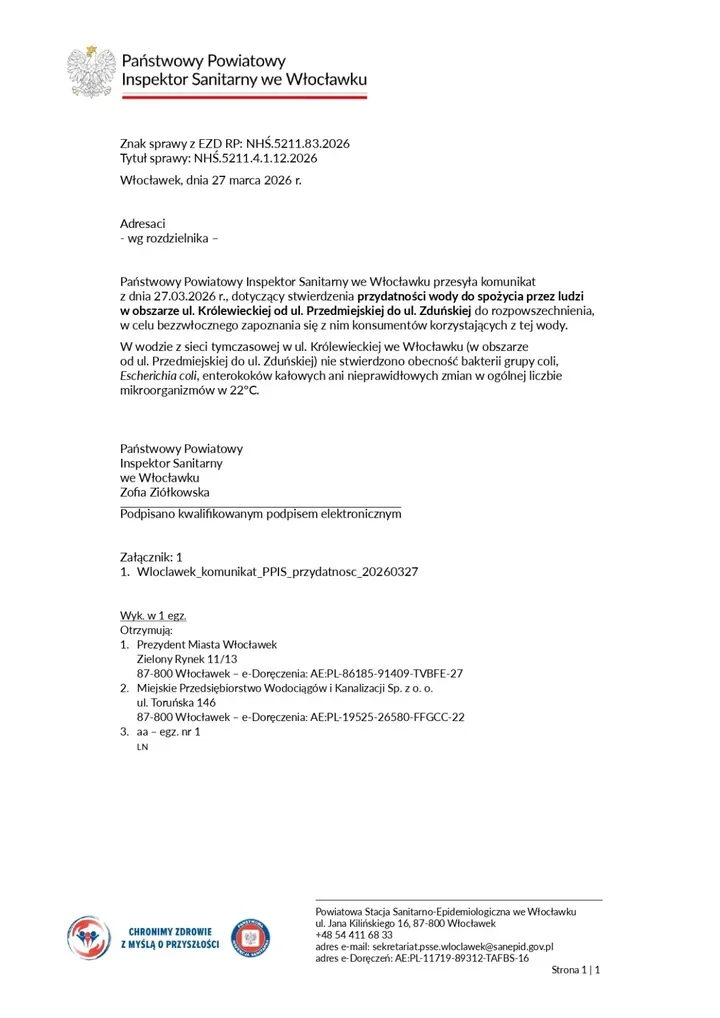 Komunikat Państwowego Powiatowego Inspektora Sanitarnego we Włocławku obejmuje mieszkańców korzystających z wody na odcinku ul. Królewieckiej od ul. Przedmiejskiej do ul. Zduńskiej. W badaniach nie wykryto bakterii grupy coli, Escherichia coli ani enterokoków kałowych, a także nie stwierdzono nieprawidłowości w ogólnej liczbie mikroorganizmów w 22°C.