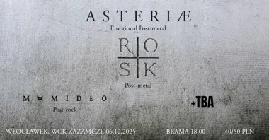 - ASTERIÆ — pięcioosobowy zespół z Poznania łączący elementy post-metalu i hardcore. W ich muzyce słychać kontrast między przestrzennymi partiami gitar a agresywną perkusją i krzykliwym wokalem. Debiutowali w 2023 roku albumem wydanym w formule DIY, a w 2024 roku ukazał się koncertowy materiał dokumentujący ich sceniczną energię. Na koncercie zaprezentują także materiał zapowiadający nadchodzący album (premiera planowana na 4 listopada 2025).