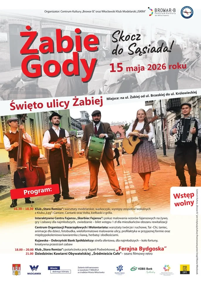Tego popołudnia ul. Żabia zamieni się w długi, sąsiedzki festyn pełen ruchu, kolorów i lokalnych atrakcji. ŻABIE GODY – Skocz do Sąsiada to okazja, żeby zajrzeć na jedną z bardziej charakterystycznych ulic Włocławka, zobaczyć, co szykują lokalne instytucje i po prostu poczuć klimat wspólnego świętowania. Będzie twórczo, rodzinnie i bardzo różnorodnie — od fajansu i modelarstwa po taniec, grill i wieczorną potańcówkę.